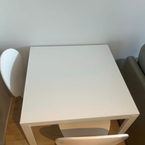 Hyväkuntoinen, tukeva, näppärä pienempääkin keittiöön. Ostettu käytettynä täältä torista vuosi sitten, sievästi pidetty. Ainut miinus jos on tarkka: kissa jyrsinyt tuolien päitä sekä pöytä ottanut pari kolhua tms joten maali lähtenyt ihan vähän (kuvissa.)