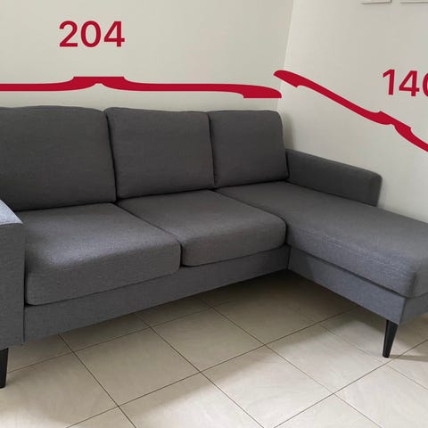 Iskusta ostettu kulmasohva. 6 henkilöä mahtuu istumaan.