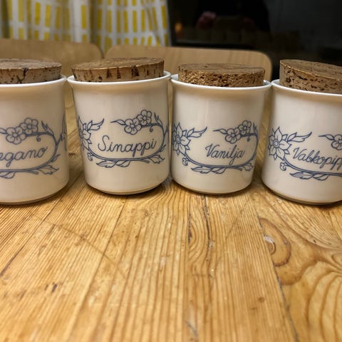 Ikäänsä nähden hyvässä kunnossa, ei lohjenneita paloja. Osa kansista ja purkeista hieman krakeloitunut, muuten siistit ja ehjät. Puukannessa ajan tuomaa kulumaa. Myydään settinä nopeimalle hakijalle. Nouto Vantaalta, kulkeutuu sopimuksen mukaan pks.