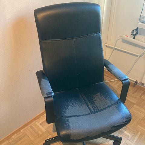 Lahjoitetaan EFG toimistotuoli. Tämä on laadukas, tukeva työtuoli ja teknisesti muuten ehjä, mutta päälliset huonossa kunnossa. Säätöjä on vaikka mitä, kuten istuimen korkeus, keinumekanismi, selkänojan kallistuksen portaaton säätö ja selkänojan korkeuden säätö. Nopeat hakijat etusijalla.