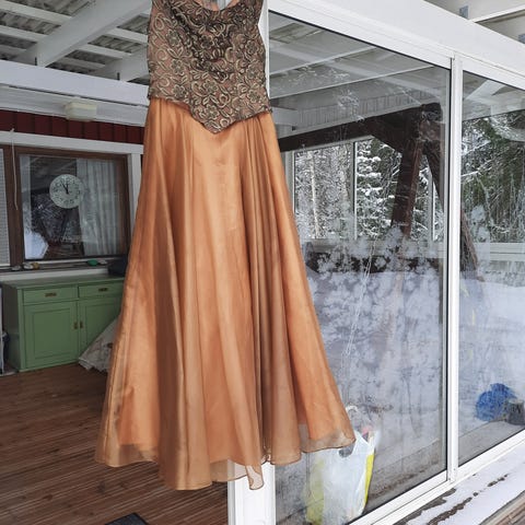 Juhlamekko. Ostettuna käytettynä ja käytettynä kerran. Hyvässä kunnossa, ei virheitä. Koko S/M. Mittoja viimeisessä kuvassa.