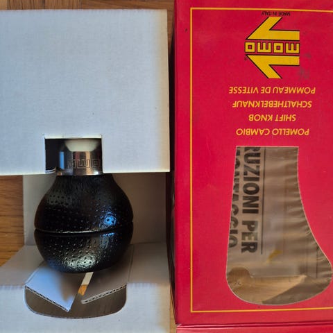 Käsijarrukahva Momo Pitstop, nahkaa. Mukana kiinnitystarvikkeet. Sopii yhteen nahkaisen Momo käsijarrusuojapussin kanssa. Kahvassa kromiosassa pieni jälki, joka näkyy kuvassa 1 oikealla alhaalla. Hinta yhteishinta