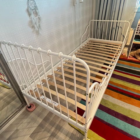 IKEA Minnen sänky valkoinen. Sängyssä on metallinen runko klassiset ajattomat koristeet päädyissä ja vanerinen sälepohja. Sopii lapselle juniorivuoteeksi, mutta se kasvaa lapsen mukana ja sopii myös aikuiselle.