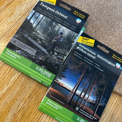 Myös Pirkanmaan retkeilykarttoja kaupan: Seitseminen Helvetinjärvi ja Tampere Orivesi. Tyvek-vedenpitäviä karttoja.