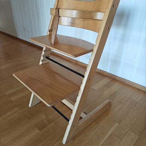 Puuinen syöttötuoli, jossa on säädettävä istuin- ja jalkataso.