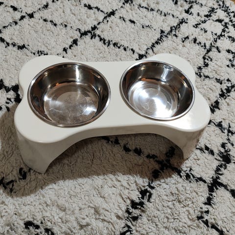 A pet food bowl made of stainless steel in good condition. Suitable for dog or cat food or water, for example.