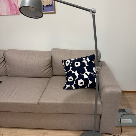 Ikean paperinen lattiavalaisin, noin 150cm korkea. Sisällä kolme lamppua, yksi palanut.