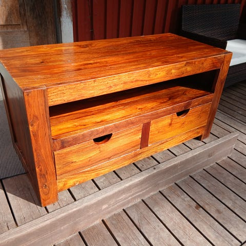 Myyn tarpeettomana Acazia -tv-tason. Painava, täyspuinen kaluste, saranat ja vetimet takorautaa.