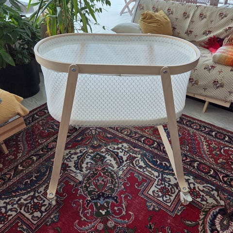 IKEA kehto vauvalle. Valkoinen, puisista säleistä koostuva runko ja keinujalka, jonka ansiosta kehtoa voi keinuttaa edestakaisin. Soveltuu vastasyntyneelle ja pienelle vauvalle nukkumiseen ja lepäämiseen. Kehto on suunniteltu sisäkäyttöön.