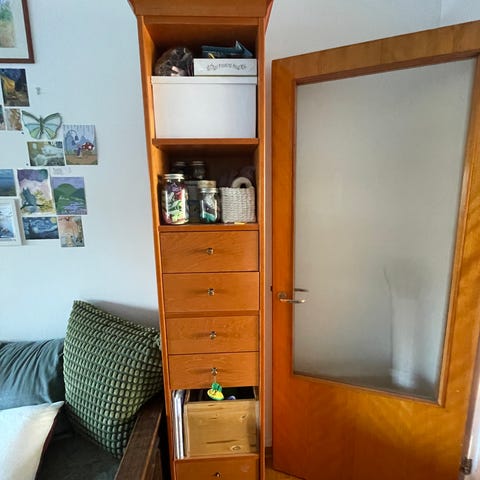 Hyväkuntoinen, kauniin ruskean sävyinen kaappi. Väri on valitettavasti vaikea saada täysin oikein esiin kuvissa.