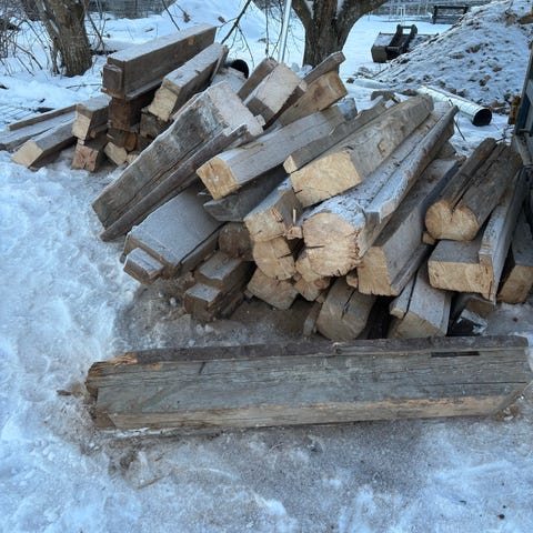 Vanhoja hirsiä. Olleet lattian runkopuina. Enempää ei ole mitä kuvan kärryllä on. Tuo isoin hirsi noin 25x25cm 30€ ja muut 15€ kpl nouto liedosta yliskulmalta.