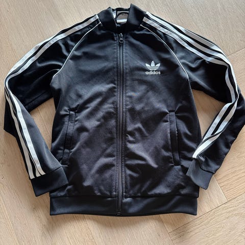 Adidas lasten verkkatakki, koko 140 cm. Väri musta, edessä harmaat vaakaraidat ja hihoissa valkoiset kolmiraitayksityiskohdat. Takissa on vetoketjukiinnitys edessä ja korkea kaulus. Sopii arki- ja urheilukäyttöön lapselle, jonka pituus on noin 140 cm.