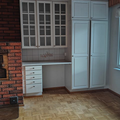 Annetaan kuvan vanhat korkeat kaapit. Ovet puiset, joskus maalattu valkoiseksi. Toisessa kaapissa hyllyjä, toinen ollut siivouskaappi. Kaapit saa irti toisistaan.