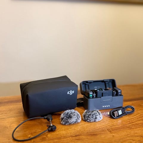 DJI Mic langaton mikrofonijärjestelmä musta. Pakettiin kuuluu latauskotelo, kaksi lähetinyksikköä, vastaanotin, kaksi tuulisuojaa, säilytyspussi sekä kaapeleita liitäntöjä varten. Järjestelmä on tarkoitettu äänen tallentamiseen esimerkiksi videokuvauksessa ja muissa tallennustilanteissa, joissa tarvitaan langatonta mikrofoniratkaisua.