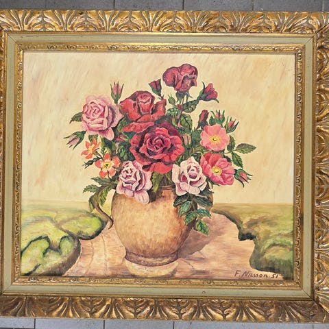 Hienoilla kehyksillä oleva ruusutaulu, signeeramaton, arvioilta 1900 -luvun alkupuolelta.