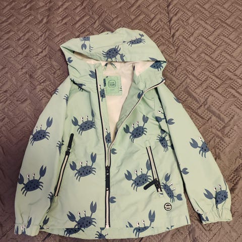 Lasten tuulitakki, koko 122. Väri vaaleanpunainen, edessä harmaat heijastavat raidat. Takissa on vetoketjukiinnitys, huppu ja joustavat hihansuut.