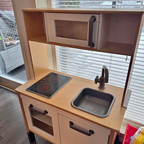 Hyväkuntoinen IKEA leikkikeittiö lapsille. Leikkikeittiössä on puinen taso, valkoiset kaapit ja harmaa allas sekä hana. Tasossa on kaksilevyinen toimiva liesi valoilla. Mukaan saa erilaisia muovisia leikkiastioita, ruokatarvikkeita ja keittiövälineitä. Myydään kasattuna, vain nouto Pohjois-Pasilasta.