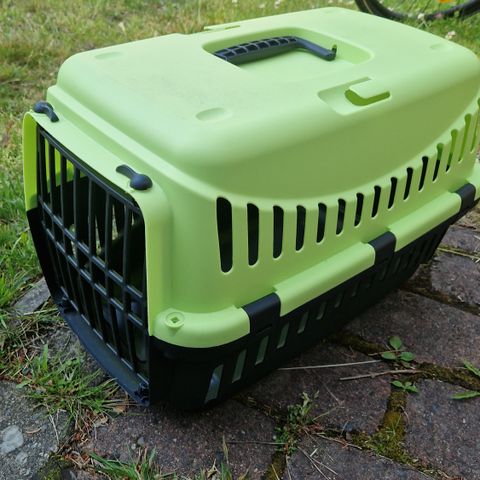 Kissan / koiran / lemmikin hyväkuntoinen ja siisti muovinen kuljetuslaatikko / kantokoppa. Pesty. Vaalean vihreä pohja ja valkoinen yläosa