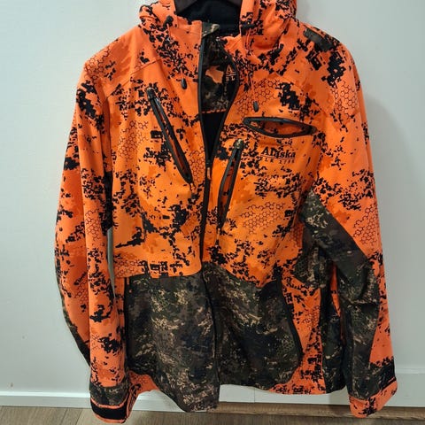 Alaska takki oranssi-musta camo-kuvio, koko XXL. Takissa huppu ja etuvetoketju. Soveltuu esimerkiksi ulkoiluun ja metsästykseen näkyvän värityksen ansiosta. Materiaalista ei ole tarkkaa tietoa, mutta pinta vaikuttaa tekniseltä ulkoilukankaalta.