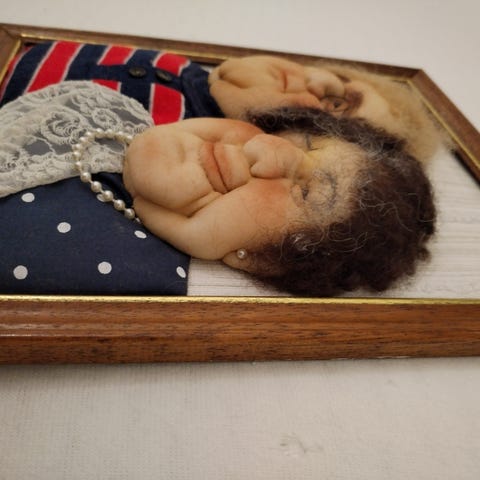 Norsutaulu puukehyksellä. Lasin alla vaalea paspis. Koko 21 x 21 cm, syvyys noin 3 cm.