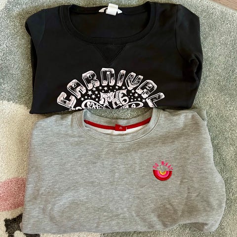 Hupparissa taskun lähellä pieniä himmeitä tahroja, jotka ei pesussa lähteneet. College paidassa pientä nukkaa. Muutoin siistissä kunnossa.