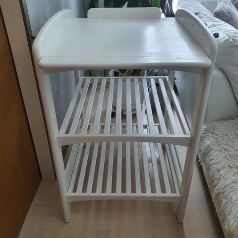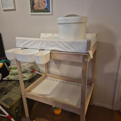 IKEA hoitopöytä, yleisilmeeltään siistissä kunnossa. Hoitotasossa pieni tummentuma ja alempana naarmu, jotka näkyvät kuvissa. Tason voi laskea alemmas jolloin voidaan käyttää työpöytänä, myös laatikot ovat irrotettavissa/paikat vaihdettavissa.