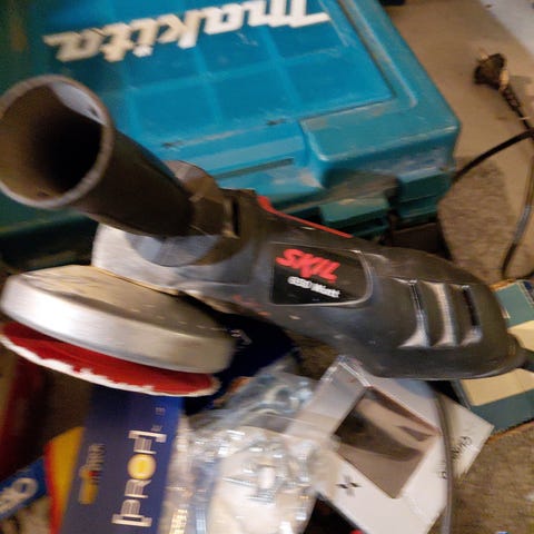 Johdollinen kulmahiomakone, oranssi runko ja musta sivukahva. Laitteessa on suojakotelo ja hiomalaikka paikallaan. Soveltuu metallin ja muiden kovien materiaalien hiontaan ja katkaisuun oikeanlaista laikkaa käyttäen. Virtajohto kiinteästi koneessa. 125 laikka soveltuu