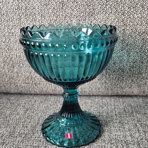 Iittalan punainen siistikuntoinen Mariskooli. Pohjassa marimekko teksti. Ostettu pari vuotta sitten käytettynä Marimekon "pre loved" sivustolta, jossa myydään käytettyjä aarteita. Ollut vain vitriinissä koristeena meillä.