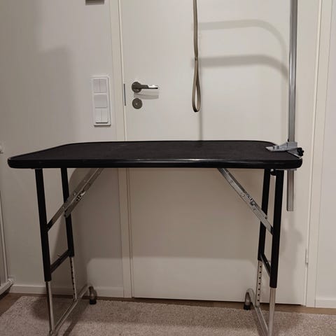 Kokoontaitettava trimmipöytä, jossa jalat on saranoitu pöytäleyn alla. Tästä johtuen jalkojen rakenne on yhtenäinen ja tämä tekee pöydästä vakaan. Pöydänkannessa on uritettu kumimatto, jossa lemmikin tassuilla on hyvä pito.