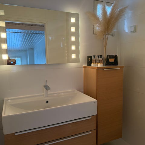 Kylpyhuoneen allaskaappi pesualtaalla puunvärinen