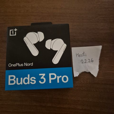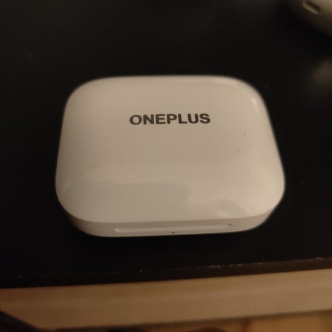 OnePlus langattomat nappikuulokkeet latauskotelolla. Kotelossa teksti "Co-created with Dynaudio". Väri vaalea beige ja valkoinen. Korviin asetettavat nappikuulokkeet, joissa merkitty vasen (L) ja oikea (R) puoli. Sopivat langattomaan kuunteluun esimerkiksi puhelimen tai muun Bluetooth-laitteen kanssa. Kotelon avulla kuulokkeet voidaan säilyttää ja ladata käytön välillä.
