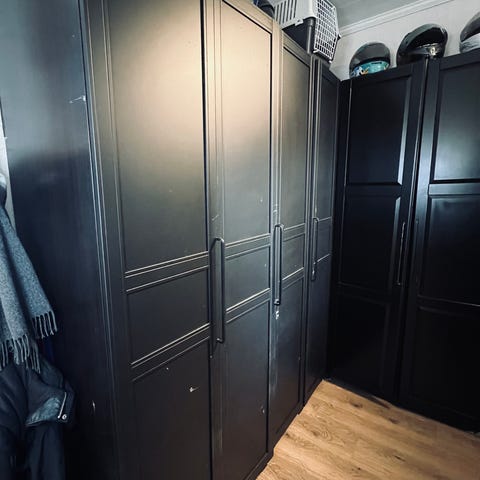 Kaksi 75x35x236 kokoista ikea pax vaatekomeroa ja niihin lasiliukuovet.