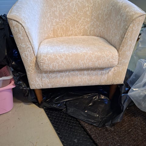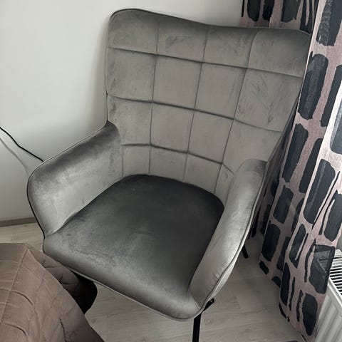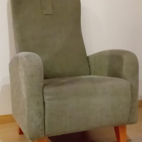 Nojatuoli punaista kangasta. Tuolissa on puiset jalat. Sopii olohuoneeseen tai lisäistuimeksi esimerkiksi makuuhuoneeseen tai työhuoneeseen.