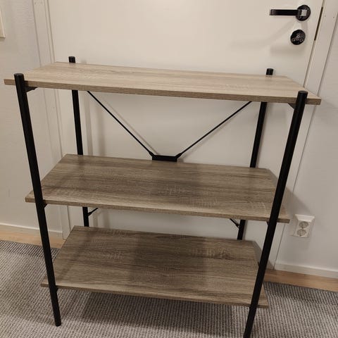 Puinen ja musta hylly / taso. Kokonaisuus koostuu puunsävyisestä elementistä ja mustasta elementistä, joita voi käyttää esimerkiksi säilytykseen tai tasona. Sopii esimerkiksi työhuoneeseen, olohuoneeseen tai lastenhuoneeseen lisäsäilytystilaksi tai huonekalun rungoksi. Mitat ja tarkempi kokoonpano eivät käy ilmi kuvista, joten ne on hyvä tarkistaa myyjältä.