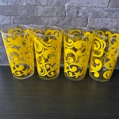 Meripihkan väriset juomalasit 1970-80 -luvulta. Viisi isompaa (1,5 dl) ja kaksi snapsilasia.