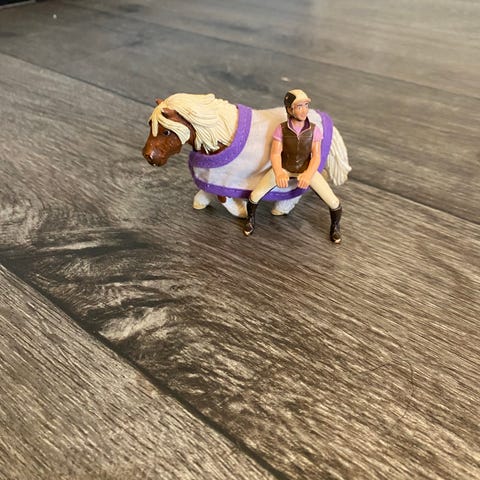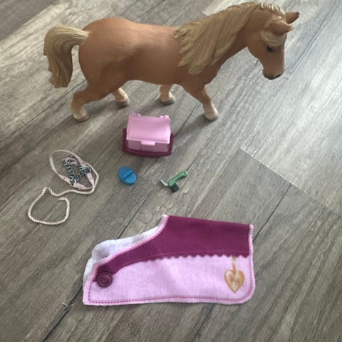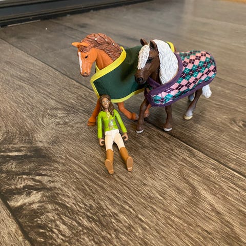 Hevostalli ja hevoshahmot -leikkisetti. Settiin kuuluu pieni tallirakennus portilla, aitauselementtejä, kaksi hevoshahmoa, ihmishahmo sekä erilaisia varusteita ja tarvikkeita, kuten loimia, heinäpaali ja ruokakappaleita. Sopii hevosleikkeihin ja talliympäristön rakentamiseen.