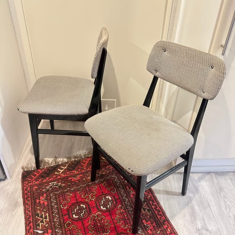 Kolme kappaletta tuoleja. Ei tietoa aitoudesta. Hyvässä kunnossa, kuvassa huonokuntoisin istuin.