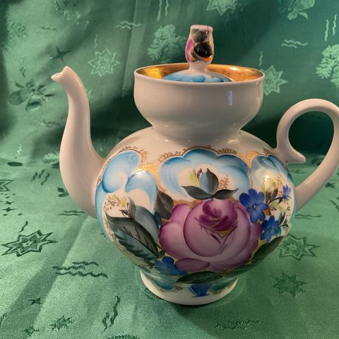 Lomonosov teekannu posliinia. Valkoinen pohjaväri, monivärinen koristekuvio ja kullattuja yksityiskohtia. Kannussa on kaatonokka ja kahva sekä irrotettava kansi. Pohjassa valmistajamerkintä ja teksti "Made in USSR". Sopii teen hauduttamiseen ja tarjoiluun tai koriste-esineeksi keittiöön tai ruokailutilaan.