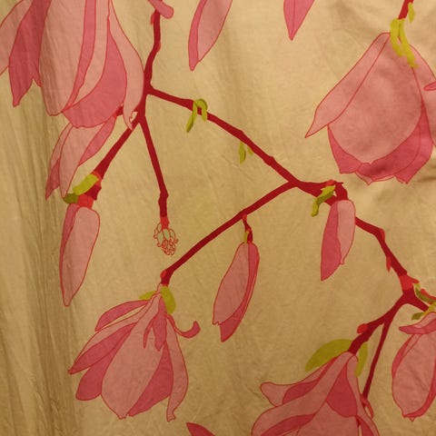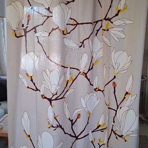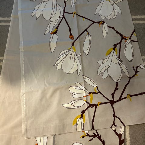 Uudenveroiset Marimekko verhot, kuosi Keisarinna (Erja Hirvi 2007). Koko n. 144 x 317cm. Harmaa pohja jossa valkoisia kukkia, joissa hyvin himmeän vaaleankeltaisia terälehtiä joukossa. Kiinnitysnauha näkyy kuvissa, samoin alakäänne. Vain nouto Lauttasaari.