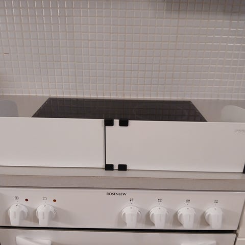 Myydään liesisuoja, joka sopii 50 cm leveään perinteiseen sähköhellaan. Kiinnitys hellan sivuihin messinkikiinnikkeillä, jossa on valittavana kaksi eri säätökorkeutta. Uuninluukun kahvakiinnike puuttuu, mutta sen voi tehdä itse vaikka rautalangasta tms. Liesisuoja on pesty astianpesukoneessa ja kiinnikkeet puhdistettu käsin, joten rasvajälkiä ei ole.