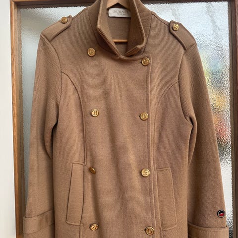 Busnellin ajattoman tyylikäs ja monipuolinen villatakki. Klassinen kaksirivinen napitus ja epauletit. Takki sopii hyvin sisäkäyttöön, kerrospukeutumiseen sekä ulkokäyttöön. Kamelinvärinen kultaisilla napeilla. Koko sopii small ja medium kokoisille. Aivan ihana (liian pieni minulle nykyään)!