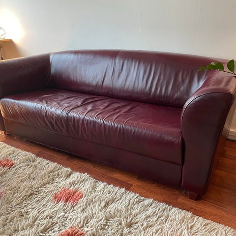 Vepsäläisen Quatro, nahkasohva. Matala istuinkorkeus. Tyynyt irroitettavat, voi käyttää vuodesohvana. Kaikki osat irroitettavia.