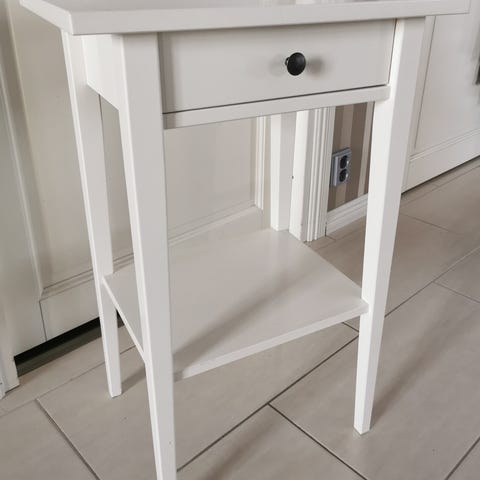 Hyväkuntoinen ja yleisilmeeltään siisti, valkoinen Ikea Hemnes kapea hyllykkö. Keskimmäinen hylly kiinteä, muut irrallisia. Pohjalevy irroitettava, joka mahdollistaa johtojen kuljetuksen sitä kautta. Hyllykkö kiinnitetään turvallisuussyistä seinään ylälaidastaan.