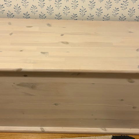Puinen säilytysarkku, jossa saranoitu kansi. Ulkopuoli on maalattu valkoiseksi turkooseilla reunuksilla, sisäpuoli on lakattua puuta. Soveltuu esimerkiksi lelujen, vaatteiden tai muun kodin tavaran säilytykseen. Arkku voidaan sijoittaa eteiseen, olohuoneeseen tai makuuhuoneeseen lisäsäilytystilaksi ja istuimeksi.