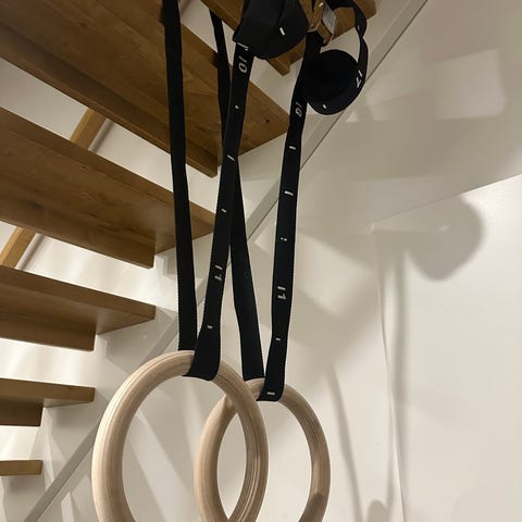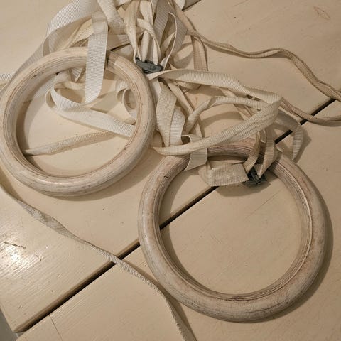 Puinen voimistelurengassetti, kaksi rengasta ja mustat säädettävät remmit. Remmeissä kulumaa mutta pitää silti hyvin.