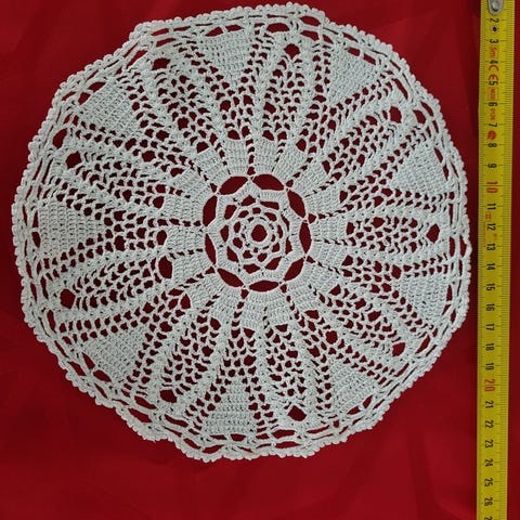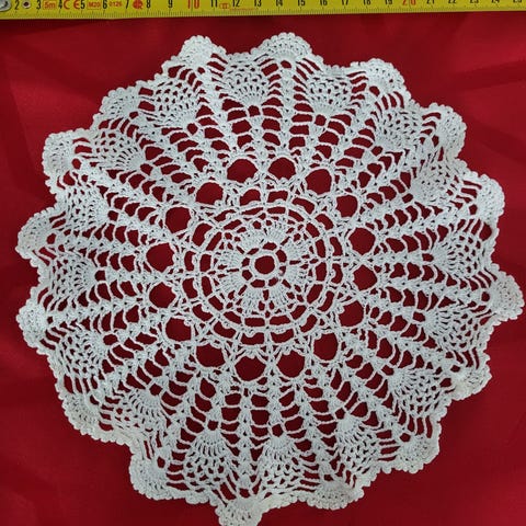 Valkoinen virkattu pitsiliina, soikea malli.