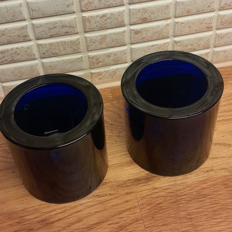 Isot Iittalan Marimekolle valmistamat siniset tuikut (korkeus 8 cm ja halkaisija 8 cm). Kaksi tuikkua. En postita, mutta Kuopion lähialueella voin tuoda.