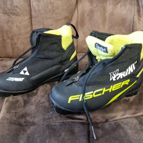 Fischer XCJ Sprint hiihtomonot NNN-siteelle. Lasten tai nuorten malli, jossa vetoketjullinen päällinen ja nauhakiinnitys sisällä. Väritys musta–harmaa keltaisilla yksityiskohdilla. Pohjassa NNN-yhteensopiva rakenne maastohiihtoon.