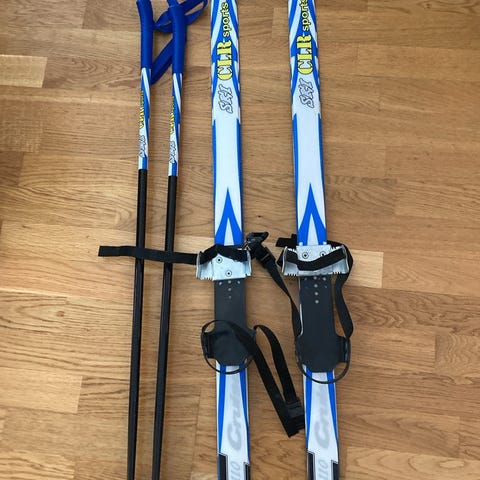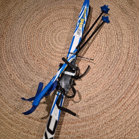 Lasten sukset 90cm ja sauvat 70cm. Suksissa on remmilliset siteet, jotka sopivat käytettäväksi tavallisten talvikenkien kanssa.