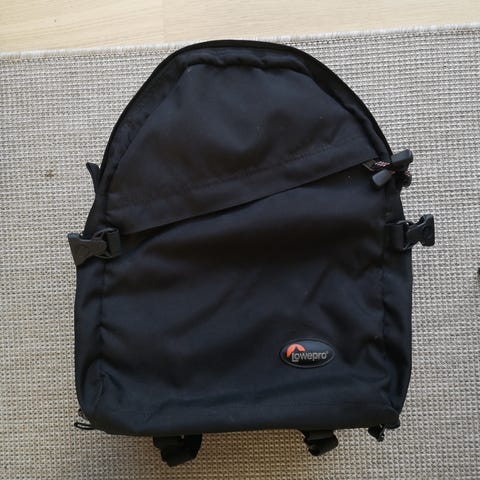 Suuri Lowepro kamerareppu. Laukussa on pehmustettu sisäosa, jossa siirrettävät väliseinät kamerarungolle, objektiiveille ja tarvikkeille. Sisäosa on vaaleaa kangasta, joka helpottaa varusteiden löytämistä. Edessä on solkikiinnitys ja säädettävä olkahihna. Soveltuu kamerakaluston kuljettamiseen ja säilyttämiseen.